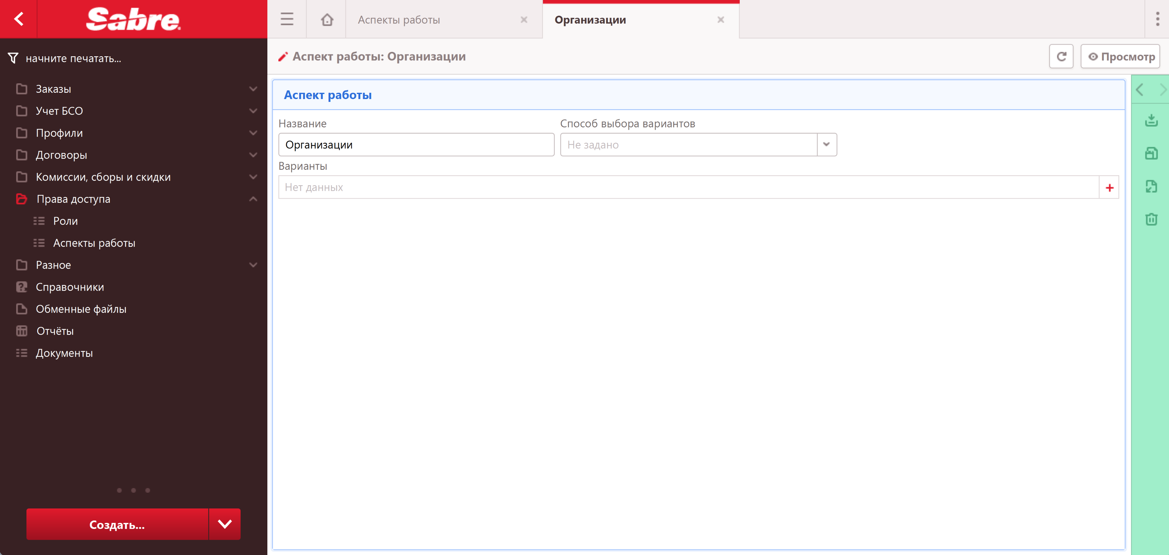 В появившемся редакторе аспекта работы внесите наименование аспекта в поле Название, значение Способ выбора вариантов можно оставить пустым. Теперь, нужно создать первый вариант с правами доступа. Для этого, необходимо нажать кнопку + в таблице Варианты: