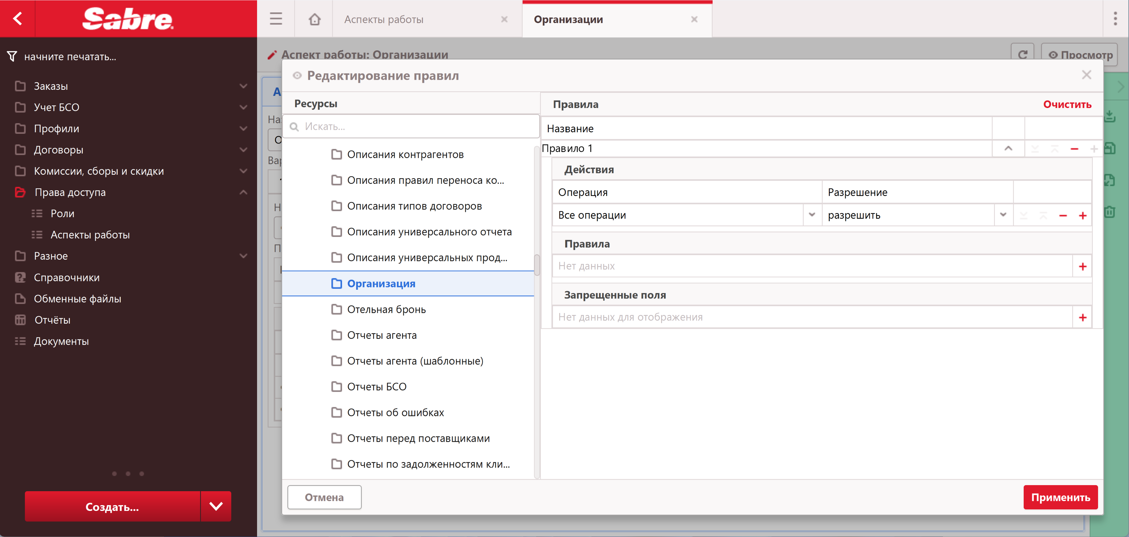 Начнем с аспектов работы. Аспект представляет собой набор прав доступа объединенных какой-то одной тематикой. Например, аспект работы может относиться к профилям организаций, или к заказам, или к отчетам. По какой тематике группировать правила решает сам пользователь на свое усмотрение. Но основная идея заключается в том, чтобы разделить контексты таким образом, чтобы каждый отдельно взятый аспект работы отвечал за определенную тематику.