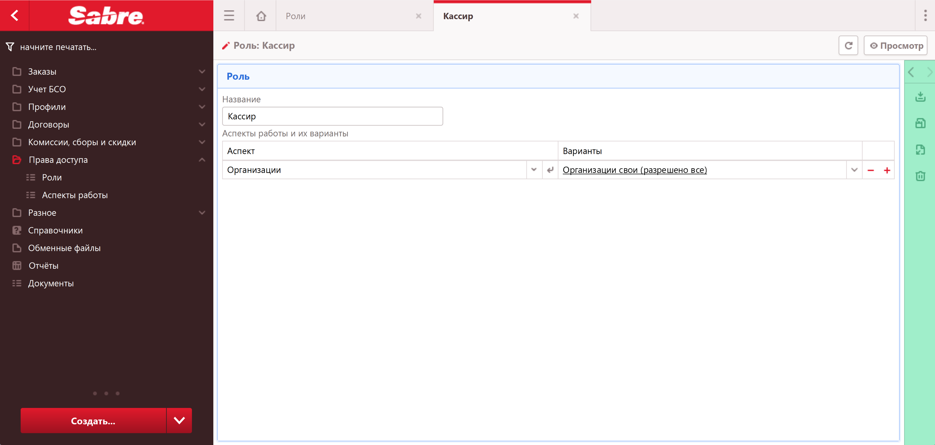 Теперь рассмотрим роли. Роль это логический концепт, подразумевающий функционал сотрудника. В зависимости от функционала сотрудника, определяются и его полномочия. Иначе говоря, роль определяет набор прав доступа которые будут предоставлены сотруднику с этой ролью. Сама роль состоит из набора связанных с ней аспектов работы. При этом, при привязке аспекта работы к роли необходимо указать какой вариант будет использован из доступных в аспекте. Например, для роли администратора можно использовать вариант Организации все (разрешено все), а для роли менеджер Организации свои (разрешено все). Как комбинировать аспекты и варианты для роли решает пользователь.