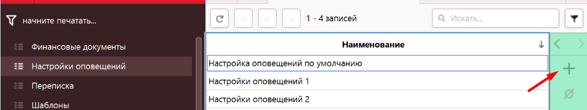 В рабочей области появится новый список Настройки оповещений, в котором сразу же будет добавлен объект Настройки оповещений по умолчанию
