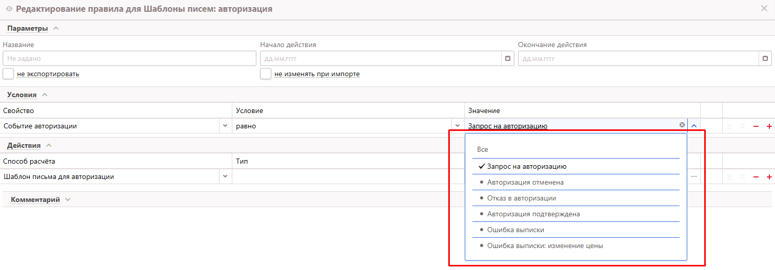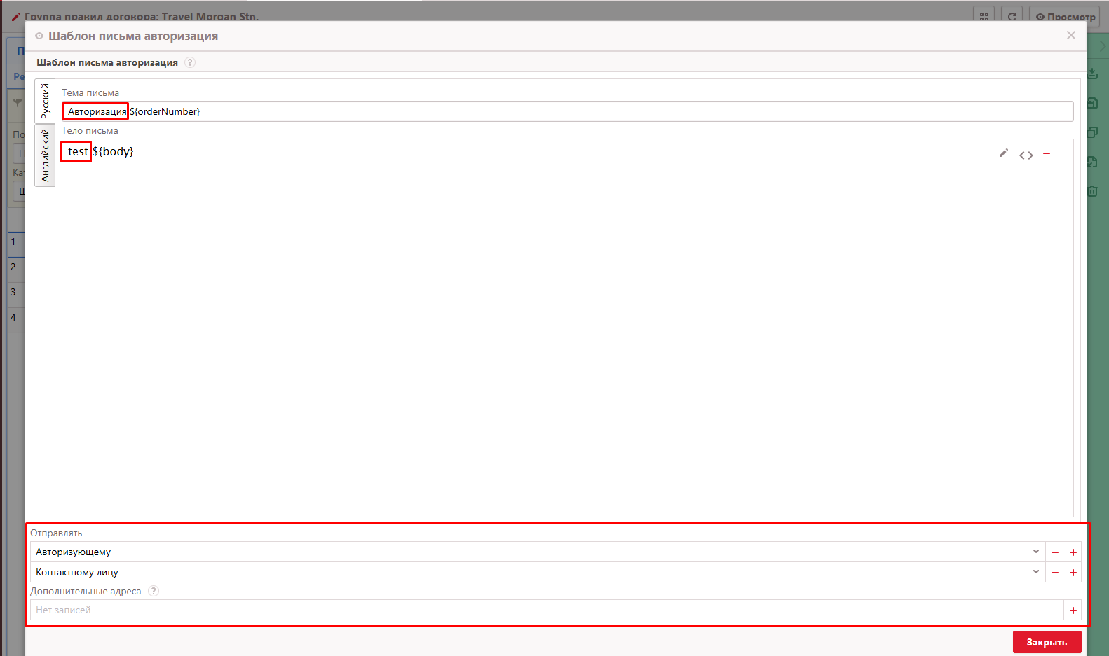 - Адресатов. В каждом событии могут быть разные адресаты. Если в одном шаблоне есть несколько человек с совпадающими email, то приходит одно письмо. Исключение: если событие = запрос авторизации, то будут направлены несколько писем, даже в случае совпадения email. Одно письмо с кнопками "отказать/подтвердить" уйдет авторизующему, второе в виде уведомления тем, кто еще настроен в шаблоне на событие = запрос на авторизацию.