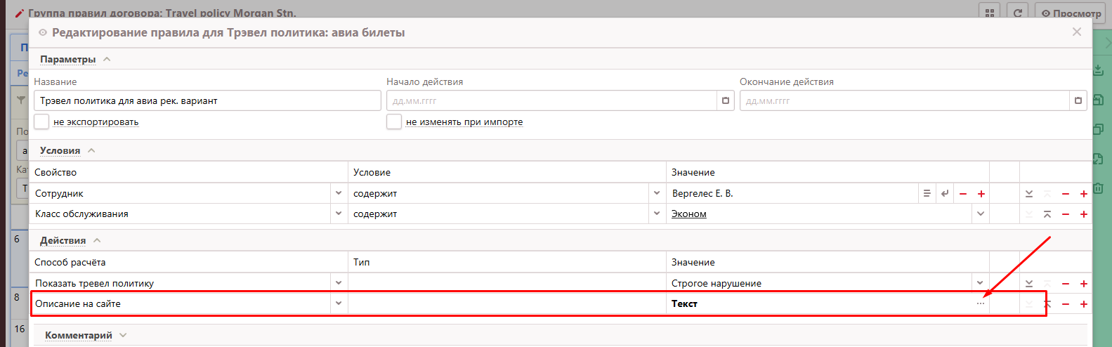1.8. Добавить описание к тревел политике можно через действие Описание на сайте. Свободный текст нужно добавить через троеточие.