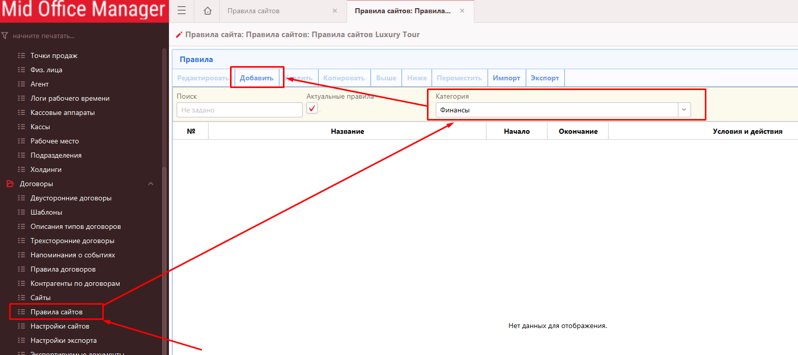1.1. Открыть «Правила сайта» — выбрать из выпадающего списка категорию «Финансы» и нажать на кнопку «Добавить»