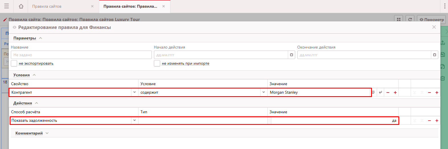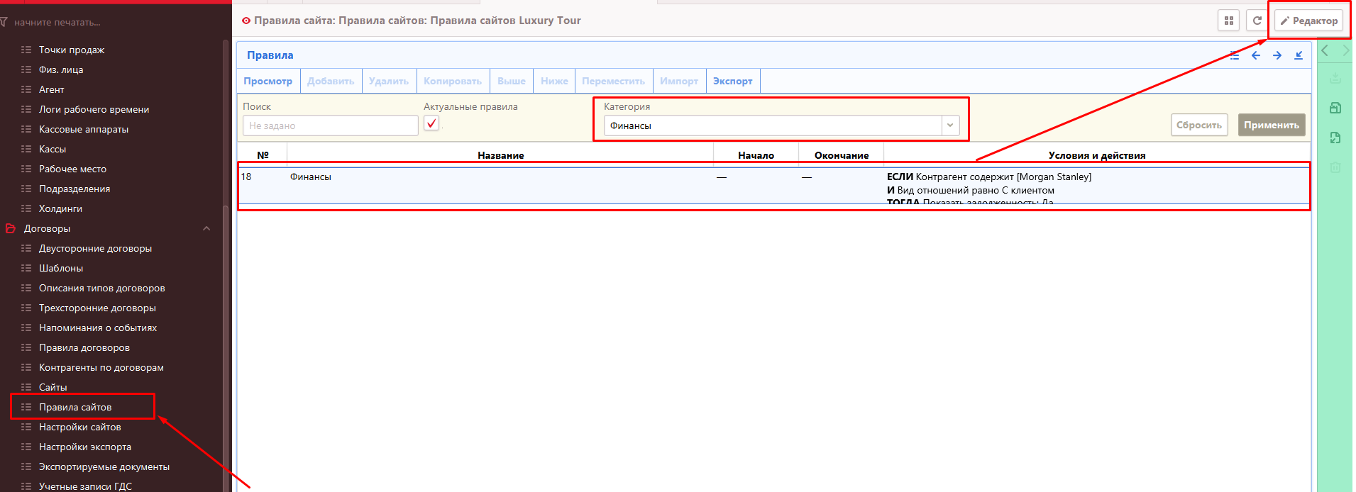 2.1. Открыть «Правила сайта» — выбрать из выпадающего списка категорию «Финансы» - найти нужное правило — войти в режим редактирования