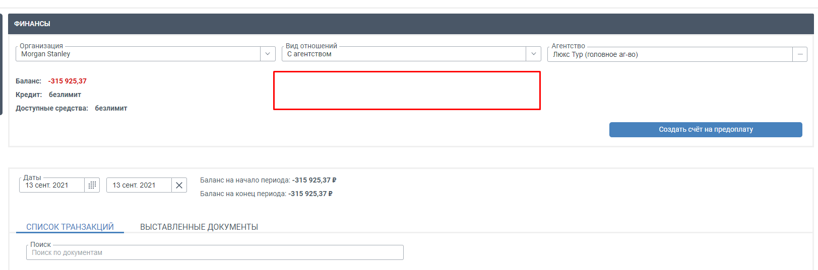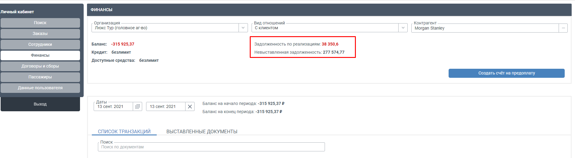Во вкладке Финансы можно включить/отключить отображение задолженности по реализациям и невыставленную задолженность для агентства и клиента. Можно включить для агентства и отключить для клиента.