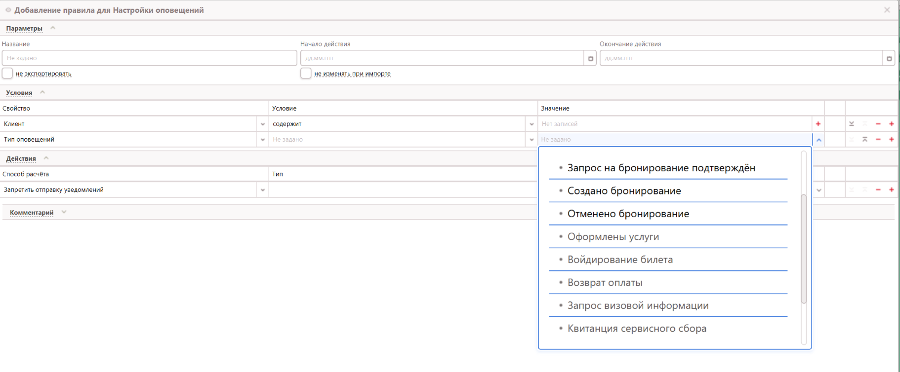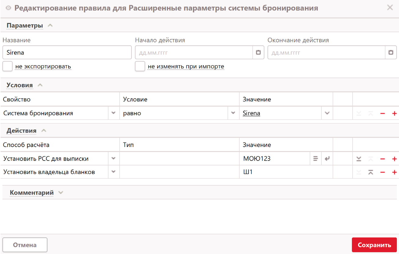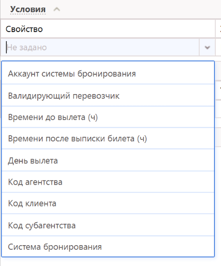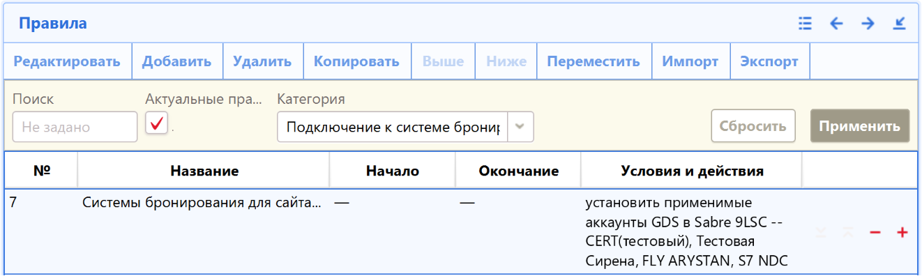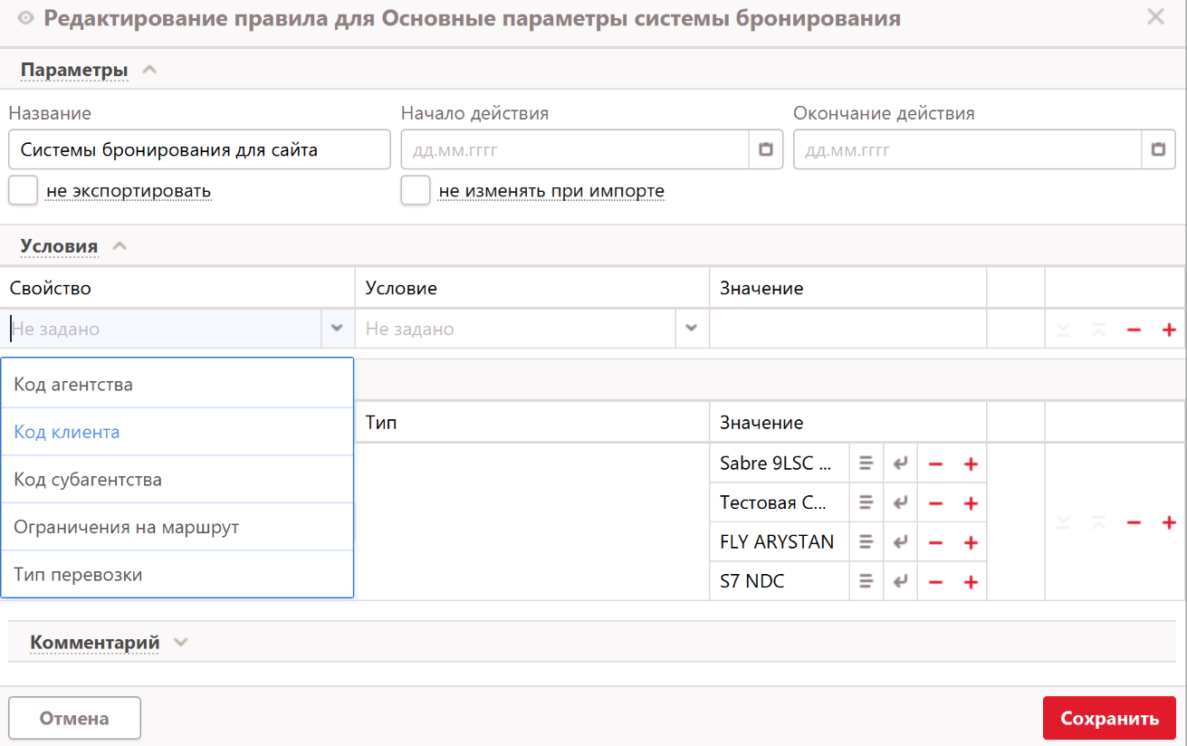 Можно указать системы бронирования без использования условий, тогда правило будет применяться глобально. В случае, когда нужно для агентства, субагента, корпоративного клиента настроить отдельно системы бронирования, то можно воспользоваться соответствующими условиями.