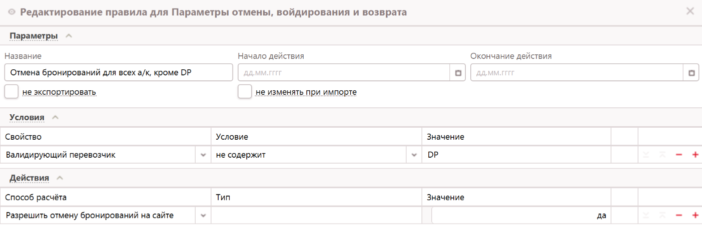 Пример: Отмена бронирования разрешена для всех перевозчиков, кроме перевозчика с кодом DP: