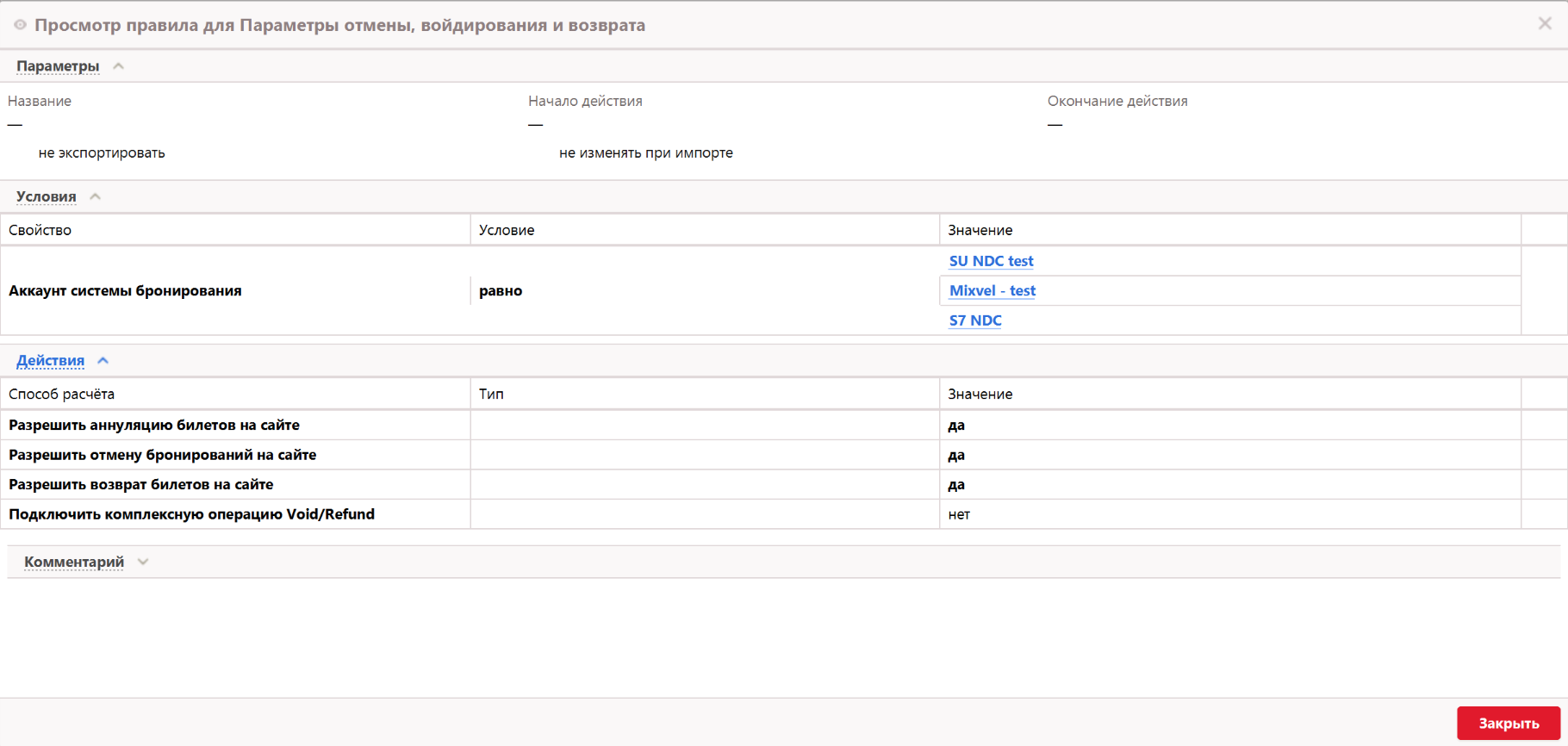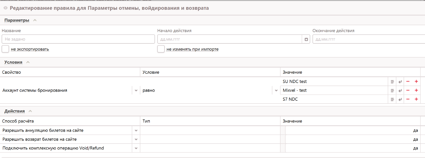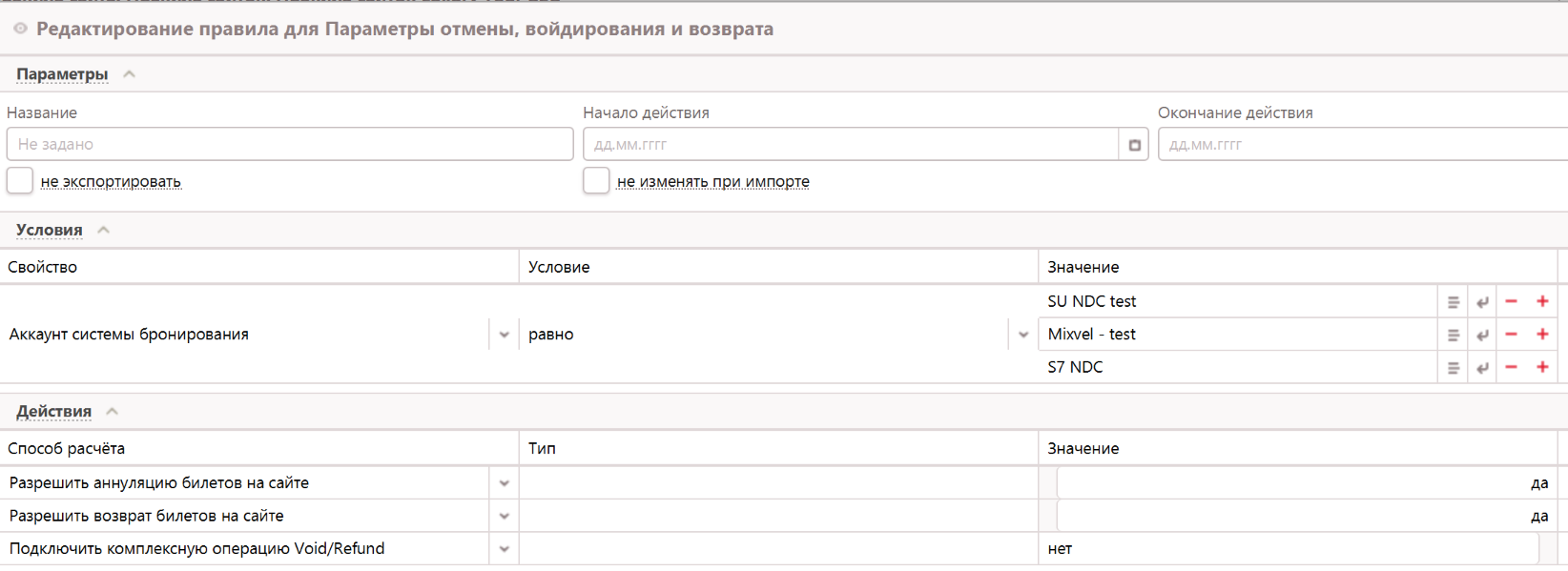 В этой категории определяются параметры отмены бронирования, аннуляции и возврата билета.
