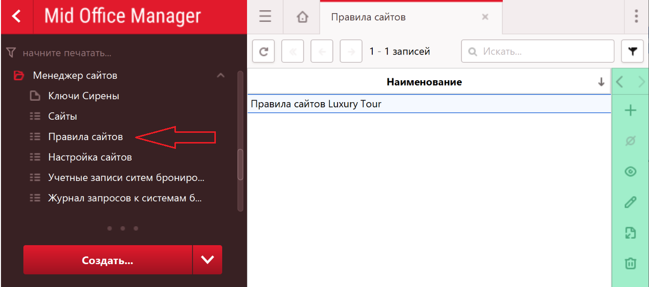 В этом разделе рассмотрим все параметры правил сайта детально. Правила сайта позволяют определить логику поведения сайта, правила взаимодействия с системами бронирования, подключить платежные шлюзы. Через редактор рабочей области добавим список Правила сайта. По кнопке (plus) добавим объект, назовем его Правила сайта: