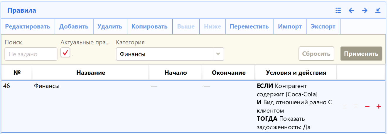 Пример: Добавлено правило, если контрагент Соса-Соla и вид отношений с клиентом, то показать задолженность: