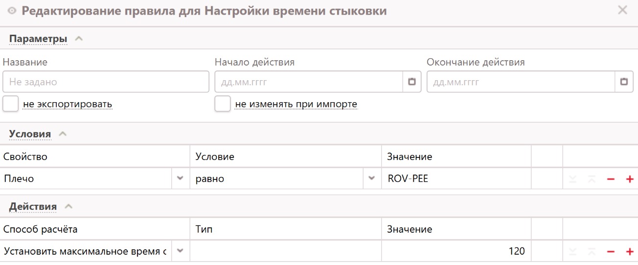 В этой категории определяются ограничения по отбору и отображению результатов поиска перелетов в зависимости от времени стыковки. Описание доступных вариантов условий и действий правил этой категории: