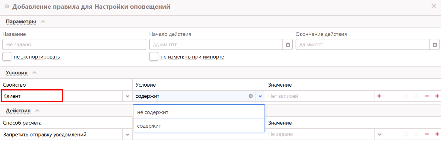 1. Клиент - можно задать корпоративного клиента, для которого будет работать правило. Также исключить клиента - правило будет отрабатываться для всех корпорантов, кроме заданного.