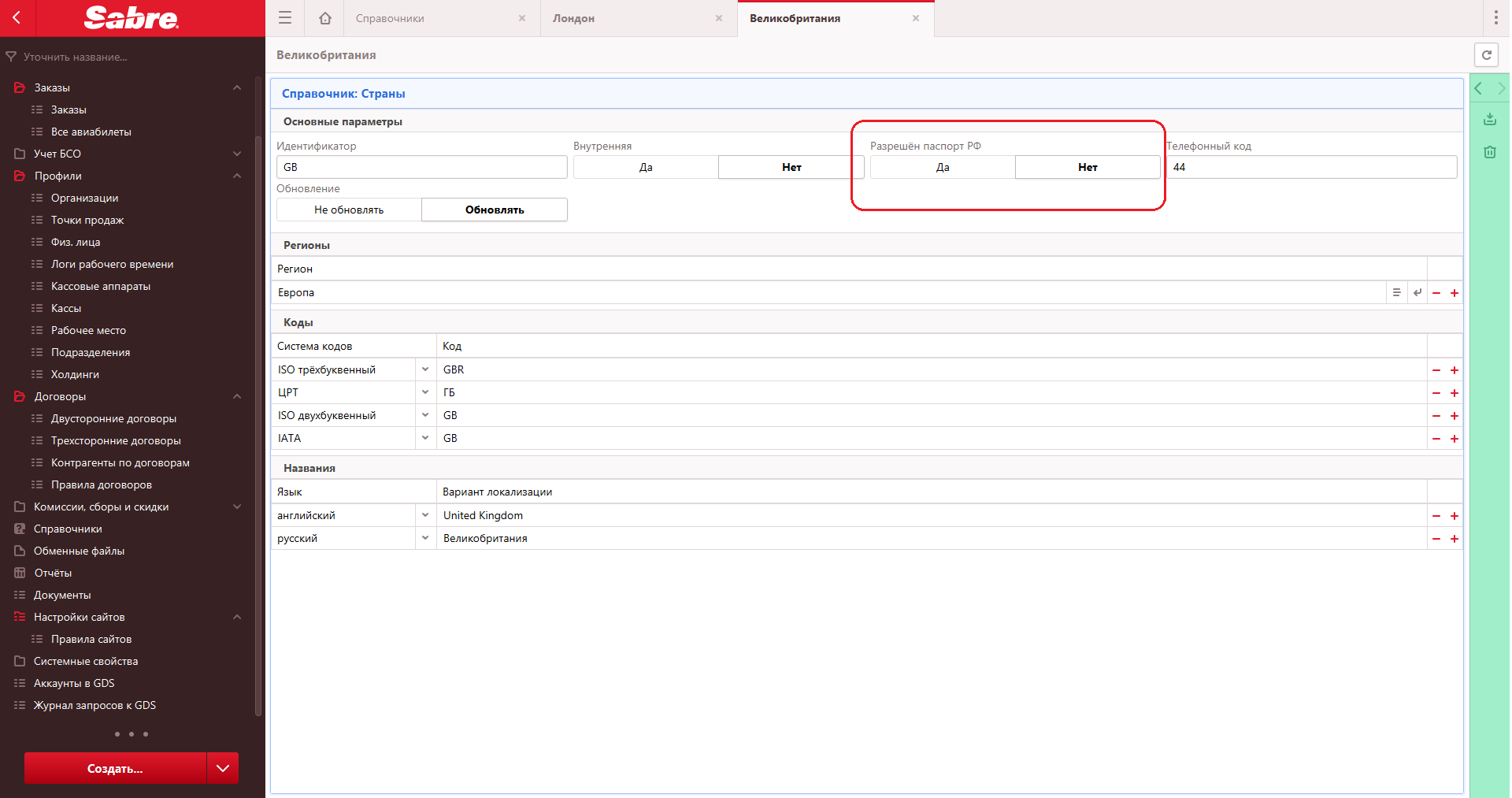 В справочнике Страны есть настройка, позволяющая использование паспорта РФ (внутренний российский паспорт) при оформлении перелета, маршрут которого построен через указанную страну.